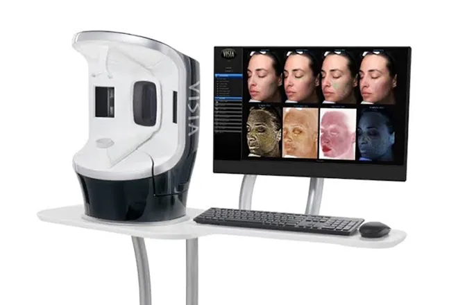 VISIA(肌診断機)は、シミやしわなど肌の状態を詳細に分析することができる肌診断器です。カラー写真とUV写真で撮影した肌の画像を解析し、しわ・シミ・毛穴などの項目を評価します。目では確認しにくい隠れたシミも検出できます