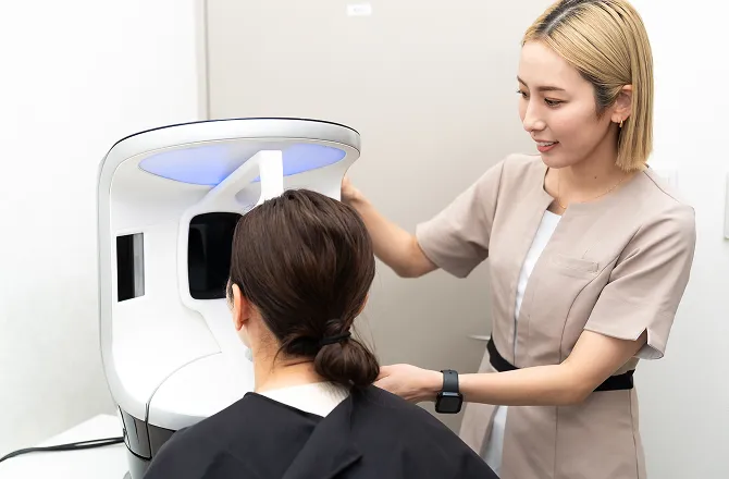 問診票をもとに、ナースまたはカウンセラーが事前にご希望を伺います。その後、肌診断機を使用して、肌の状態を数値と画像で分析します。肌質、生活習慣、お悩みに合わせた施術プランのご提案に役立てます。当院で施術を受けられる方は、肌診断を無料でご利用いただけます。
